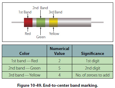 Figure 10-49 provides an example, which illustrates the rules for reading the resistance value of a resistor marked with the end-to-center band system. This resistor is marked with three bands of color, which must be read from the end toward the center.