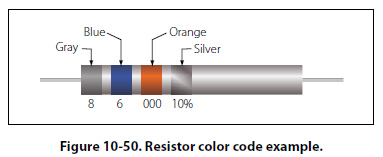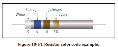 The following paragraphs provide a few extra examples of resistor color band decoding. Figure 10-50 contains a resistor with another set of colors. This resistor code should be read as follows: