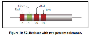 Sometimes circuit considerations dictate that the tolerance must be smaller than 20 percent. Figure 10-52 shows an example of a resistor with a 2 percent tolerance. The resistance value of this resistor is 2,500 ± 2 percent ohms. The maximum resistance is 2,550 ohms, and the minimum resistance is 2,450 ohms.