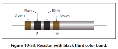 Figure 10-53 contains an example of a resistor with a black third color band. The color code value of black is zero, and the third band indicates the number of zeros to be added to the first two digits.