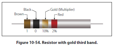 In this case, a zero number of zeros must be added to the first two digits; therefore, no zeros are added. Thus, the resistance value is 10 ± 1 percent ohms. The maximum resistance is 10.1 ohms, and the minimum resistance is 9.9 ohms. There are two exceptions to the rule stating the third color band indicates the number of zeros. The first of these exceptions is illustrated in Figure 10-54. When the third band is gold in color, it indicates that the first two digits must be multiplied by 10 percent. The value of this resistor in this case is: