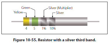 When the third band is silver, as is the case in Figure 10- 55, the first two digits must be multiplied by 1 percent. The value of the resistor is 0.45 ± 10 percent ohms.