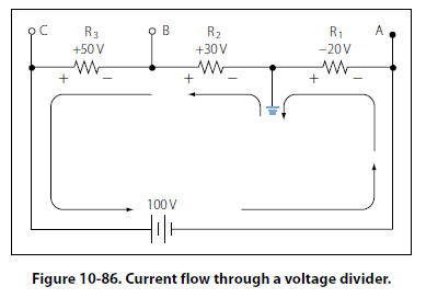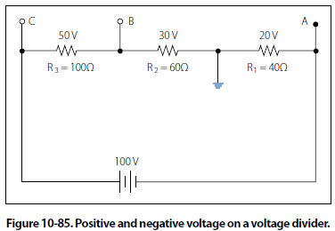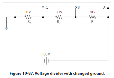 Figure 10-87 shows the voltage divider used previously. The voltage drops across the resistances are the same; however, the reference point (ground) has been changed. The voltage between ground and tap A is now a negative 100 volts, or the applied voltage.
