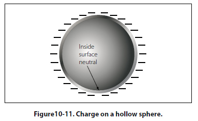 Another example, shown in Figure 10-11, is the charge on a hollow sphere. Although the sphere is made of conducting material, the charge is evenly distributed over the outside surface. The inner surface is completely neutral. This phenomenon is used to safeguard operating personnel of the large Van de Graaff static generators used for atom smashing. The safest area for the operators is inside the large sphere, where millions of volts are being generated.