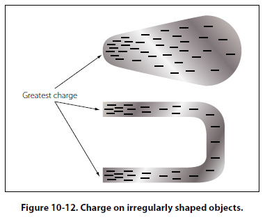 The distribution of the charge on an irregularly shaped object differs from that on a regularly shaped object. Figure 10-12 shows that the charge on such objects is not evenly distributed. The greatest charge is at the points, or areas of sharpest curvature, of the objects.