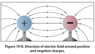 To explain the action of an electrostatic field, lines are used to represent the direction and intensity of the electric field of force. As illustrated in Figure 10-8, the intensity of the field is indicated by the number of lines per unit area, and the direction is shown by arrowheads on the lines pointing in the direction in which a small test charge would move or tend to move if acted upon by the field of force.