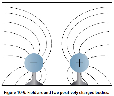 Figure 10-9 illustrates the field around bodies having like charges. Positive charges are shown, but regardless of the type of charge, the lines of force would repel each other if the charges were alike. The lines terminate on material objects and always extend from a positive charge to a negative charge. These lines are imaginary lines used to show the direction a real force takes.