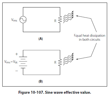 Values of Alternating Current There are three values of alternating current, which are instantaneous, peak, and effective (root mean square, RMS). Instantaneous Value An instantaneous value of voltage or current is the induced voltage or current flowing at any instant during a cycle. The sine wave represents a series of these values. The instantaneous value of the voltage varies from zero at 0° to maximum at 90°, back to zero at 180°, to maximum in the opposite direction at 270°, and to zero again at 360°. Any point on the sine wave is considered the instantaneous value of voltage. Peak Value The peak value is the largest instantaneous value. The largest single positive value occurs when the sine wave of voltage is at 90°, and the largest single negative value occurs when it is at 270°. Maximum value is 1.41 times the effective value. These are called peak values. Effective Value The effective value is also known as the RMS value or root mean square, which refers to the mathematical process by which the value is derived. Most AC voltmeters will display the effective or RMS value when used. The effective value is less than the maximum value, being equal to .707 times the maximum value. The effective value of a sine wave is actually a measure of the heating effect of the sine wave. Figure 10-107 illustrates what happens when a resistor is connected across an AC voltage source. In illustration A, a certain amount of heat is generated by the power in the resistor. Illustration B shows the same resistor now inserted into a DC voltage source. The value of the DC voltage source can now be adjusted so that the resistor dissipates the same amount of heat as it did when it was in the AC circuit. The RMS or effective value of a sine wave is equal to the DC voltage that produces the same amount of heat as the sinusoidal voltage.
