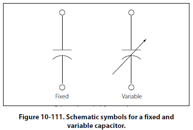 Capacitors come in all shapes and sizes and are usually marked with their value in farads. They may also be divided into two groups: fixed and variable. The fixed capacitors, which have approximately constant capacitance, may then be further divided according to the type of dielectric used. Some varieties are: paper, oil, mica, electrolytic and ceramic capacitors. Figure 10-111 shows the schematic symbols for a fixed and variable capacitor.