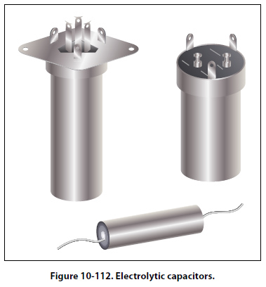 The electrolyte of the dry electrolytic unit is a paste contained in a separator made of an absorbent material, such as gauze or paper. The separator not only holds the electrolyte in place but also prevents it from short circuiting the plates. Dry electrolytic capacitors are made in both cylindrical and rectangular block form and may be contained either within cardboard or metal covers. Since the electrolyte cannot spill, the dry capacitor may be mounted in any convenient position. Electrolytic capacitors are shown in Figure 10-112.