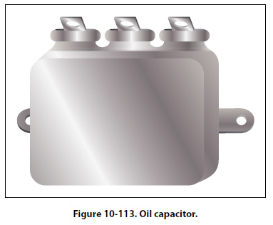 In radio and radar transmitters, voltages high enough to cause arcing, or breakdown, of paper dielectrics are often used. Consequently, in these applications capacitors that use oil or oil impregnated paper for the dielectric material are preferred. Capacitors of this type are considerably more expensive than ordinary paper capacitors, and their use is generally restricted to radio and radar transmitting equipment. [Figure 10-113]