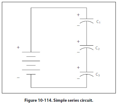 Variable Capacitors Variable capacitors are mostly used in radio tuning circuits, and they are sometimes called tuning capacitors." They have very small capacitance values, typically between 100pF and 500pF. Trimmers The trimmer is actually an adjustable or variable capacitor, which uses ceramic or plastic as a dielectric. Most of them are color coded to easily recognize their tunable size. The ceramic type has the value printed on them. Colors are: yellow (5pF), blue (7pF), white (10pF), green (30pF), and brown (60pf). Varactors A voltage-variable capacitor or varactor is also known as a variable capacitance diode or a varicap. This device utilizes the variation of the barrier width in a reversed-biased diode. Because the barrier width of a diode acts as a non-conductor, a diode forms a capacitor when reversed biased. Essentially the N-type material becomes one plate and the junctions are the dielectric. If the reversed-bias voltage is increased, then the barrier width widens, effectively separating the two capacitor plates and reducing the capacitance. Capacitors in Series When capacitors are placed in series, the effective plate separation is increased and the total capacitance is less than that of the smallest capacitor. Additionally, the series combination is capable of withstanding a higher total potential difference than any of the individual capacitors. Figure 10-114 is a simple series circuit.