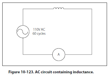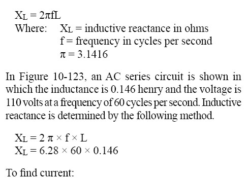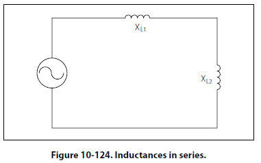 In any circuit where there is only resistance, the expression for the relationship of voltage and current is given by Ohm’s law: I = E/ R. Similarly, when there is inductance in an AC circuit, the relationship between voltage and current can be expressed as: Current = Voltage / Reactance Or I =E/XL In AC series circuits, inductive reactances are added like resistances in series in a DC circuit. [Figure 10- 124] Thus, the total reactance in the illustrated circuit equals the sum of the individual reactances.