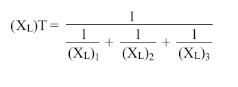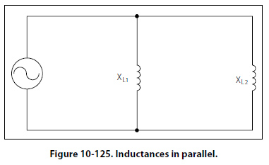 The total reactance of inductors connected in parallel is found the same way as the total resistance in a parallel circuit. [Figure 10-125] Thus, the total reactance of inductances connected in parallel, as shown, is expressed as