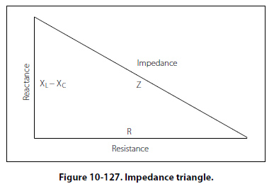 When AC circuits contain resistance and either inductance or capacitance, the impedance, Z, is not the same as the resistance, R. The impedance of a circuit is the circuit’s total opposition to the flow of current. In an AC circuit, this opposition consists of resistance and reactance, either inductive or capacitive or elements of both. Resistance and reactance cannot be added directly, but they can be considered as two forces acting at right angles to each other. Thus, the relation between resistance, reactance, and impedance may be illustrated by a right triangle. [Figure 10-127]