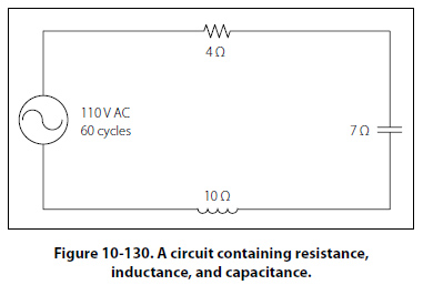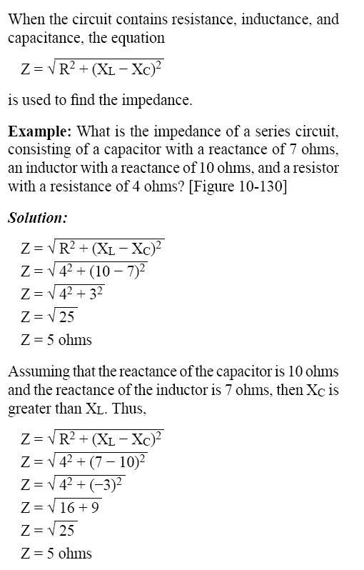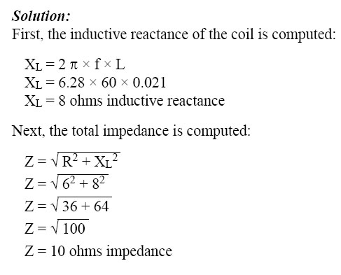 This formula can be used to determine the impedance when the values of inductive reactance and resistance are known. It can be modified to solve for impedance in circuits containing capacitive reactance and resistance by substituting XC in the formula in place of XL. In circuits containing resistance with both inductive and capacitive reactance, the reactances can be combined, but because their effects in the circuit are exactly opposite, they are combined by subtraction: X = XL - XC or X = XC - XL (the smaller number is always subtracted from the larger). In Figure 10-128, a series circuit consisting of resistance and inductance connected in series is connected to a source of 110 volts at 60 cycles per second. The resistive element is a lamp with 6 ohms resistance, and the inductive element is a coil with an inductance of 0.021 henry. What is the value of the impedance and the current through the lamp and the coil?