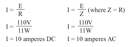AC Circuits Ohm’s Law for AC Circuits The rules and equations for DC circuits apply to AC circuits only when the circuits contain resistance alone, as in the case of lamps and heating elements. In order to use effective values of voltage and current in AC circuits, the effect of inductance and capacitance with resistance must be considered. The combined effects of resistance, inductive reactance, and capacitive reactance make up the total opposition to current flow in an AC circuit. This total opposition is called impedance and is represented by the letter Z. The unit for the measurement of impedance is the ohm. Series AC Circuits If an AC circuit consists of resistance only, the value of the impedance is the same as the resistance, and Ohm’s law for an AC circuit, I = E/Z, is exactly the same as for a DC circuit. In Figure 10-126 a series circuit containing a lamp with 11 ohms resistance connected across a source is illustrated.