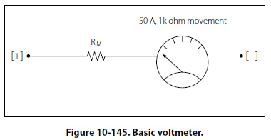 The Voltmeter The voltmeter uses the same type of meter movement as the ammeter but employs a different circuit external to the meter movement. As shown before, the voltage drop across the meter coil is a function of current and the coil resistance. In another example, 50ľA × 1000O = 50mV. In order for the meter to be used to measure voltages greater than 50mV, there must be added a series resistance to drop any excess voltage greater than that which the meter movement requires for a full scale deflection. The case of the voltmeter, this resistance is called multiplier resistance and will be designated as RM. Figure 10- 145 illustrates a basic voltmeter. This voltmeter only has one multiplier resistor for use in one range. In this example, the full scale reading will be 1 volt. RM is determined in the follow way: The meter movement drops 50mV at a full scale deflection of 50ľA. The multiplying resistor RM must drop the remaining voltage of 1V - 50mV = 950 mV. Since RM is in series with the movement, it also carries 50ľA at full scale. RM =950 mV/50ľA = 19k O Therefore, for 1 volt full scale deflection, the total resistance of the voltmeter is 20 k O. That is, the multiplier resistance and the coil resistance. Voltmeter Sensitivity Voltmeter sensitivity is defined in terms of resistance per volt (O/V). The meter used in the previous example has a sensitivity of 20 k O and a full scale deflection of 1 volt. Multiple Range Voltmeters The simplified voltmeter in Figure 10-145 has only one range (1 volt), which means that it can measure voltages from 0 volts to 1 volt. In order for the meter to be more useful, additional multiplier resistors must be used. One resistor must be used for each desired range.