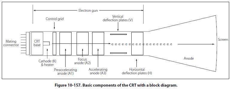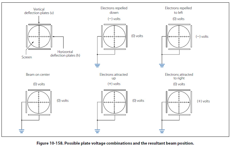 The heated cathode emits electrons. The magnitude of voltage on the control grid determines the actual flow of electrons and thus controls the intensity of the electron beam. The acceleration anodes increase the speed of the electrons, and the focusing anode narrows the beam down to a fine point. The surface of the screen is also an anode and will assist in the acceleration of the electron beam. The purpose of the vertical and horizontal deflection plates is to bend the electron beam and position it to a specific point of the screen. Figure 10-158 illustrates how the deflection plates are used to position the beam on the screen.