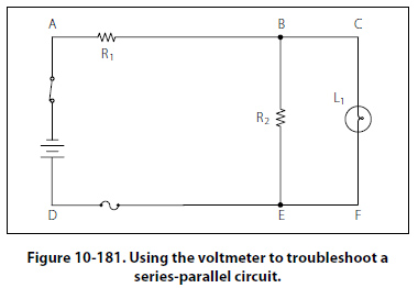 Tracing Opens with the Voltmeter To explain how the voltmeter and ohmmeter can be used to troubleshoot series-parallel circuits, the circuit shown in Figure 10-181 has been labeled at various points.
