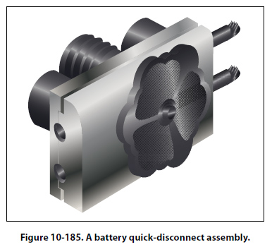 The battery box has a removable top. It also has a vent tube nipple at each end. When the battery is installed in an airplane, a vent tube is attached to each nipple. One tube is the intake tube and is exposed to the slipstream. The other is the exhaust vent tube and is attached to the battery drain sump, which is a glass jar containing a felt pad moistened with a concentrated solution of sodium bicarbonate (baking soda). With this arrangement, the airstream is directed through the battery case where battery gases are picked up, neutralized in the sump, and then expelled overboard without damage to the airplane. To facilitate installation and removal of the battery in some aircraft, a quick disconnect assembly is used to connect the power leads to the battery. This assembly attaches the battery leads in the aircraft to a receptacle mounted on the side of the battery. [Figure 10-185] The receptacle covers the battery terminal posts and prevents accidental shorting during the installation and removal of the battery.