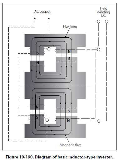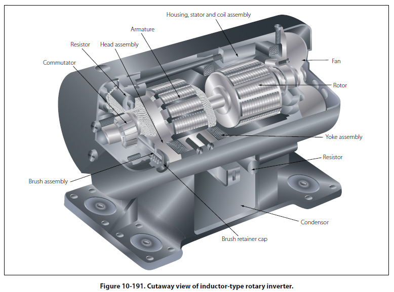 The number of poles and the speed of the motor determine the frequency of this type of inverter. The DC stator field current controls the voltage. A cutaway view of an inductor-type rotary inverter is shown in Figure 10-191.