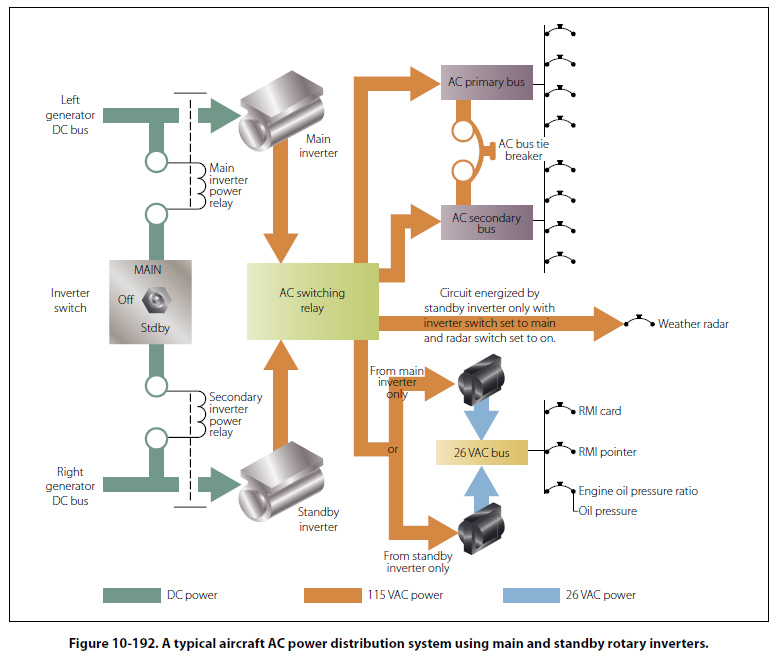 Figure 10-192 is a simplified diagram of a typical aircraft AC power distribution system, utilizing a main and a standby rotary inverter system.