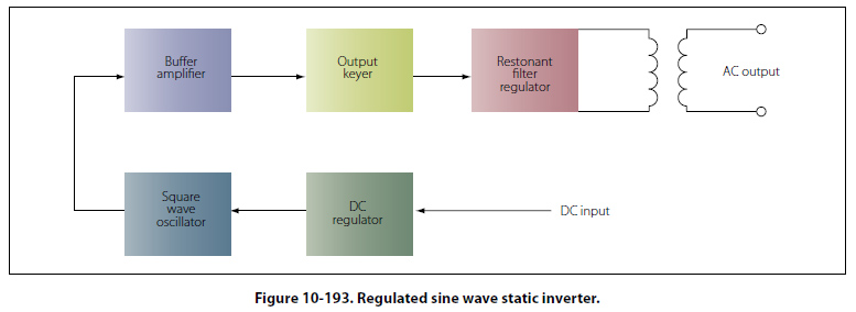 Static inverters, referred to as solid-state inverters, are manufactured in a wide range of types and models, which can be classified by the shape of the AC output waveform and the power output capabilities. One of the most commonly used static inverters produces a regulated sine wave output. A block diagram of a typical regulated sine wave static inverter is shown in Figure 10-193. This inverter converts a low DC voltage into higher AC voltage. The AC output voltage is held to a very small voltage tolerance, a typical variation of less than 1 percent with a full input load change. Output taps are normally provided to permit selection of various voltages; for example, taps may be provided for a 105, 115, and 125 volt AC outputs. Frequency regulation is typically within a range of one cycle for a 0 –100 percent load change.