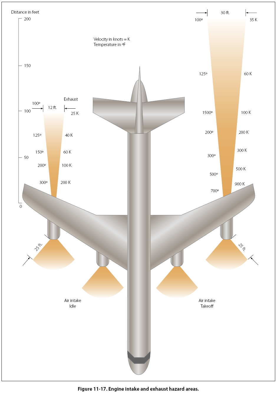 The run-up area around the aircraft should be cleared of both personnel and loose equipment. The turbofan engine intake and exhaust hazard areas are illustrated in Figure 11-17. Exercise care to ensure that the runup area is clear of all items, such as nuts, bolts, rocks, shop towels, or other loose debris (FOD). Many very serious accidents have occurred involving personnel in the vicinity of turbine engine air inlets. Use extreme caution when starting turbine aircraft.