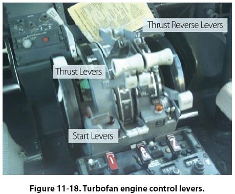 Most turbofan engine controls consist of a power lever, reversing levers, and start levers. Newer aircraft have replaced the start levers with a fuel switch. [Figure 11-18] Turbofan engines also use all the normal instruments speeds, (percent of total rpm) exhaust gas temperature, fuel flow, oil pressure, and temperature. An instrument that measures the amount of thrust being delivered is the engine pressure ratio. This measures the ratio between the inlet pressure to the outlet pressure of the turbine.