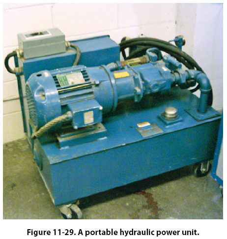 Chapter 11. Safety, Ground Operations, & Servicing Hydraulic Ground Power Units Portable hydraulic test stands are manufactured in many sizes and cost ranges. [Figure 11-29] Some have a limited range of operation, while others can be used to perform all the system tests that fixed shop test stands are designed to perform. Hydraulic power units, sometimes called a hydraulic mule, provide hydraulic pressure to operate the aircraft systems during maintenance. They can be used to: