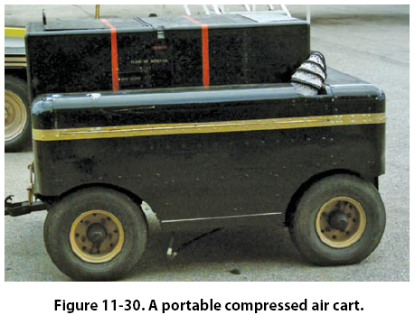This type of portable hydraulic test unit is usually an electrically powered unit. It uses a hydraulic system capable of delivering a variable volume of fluid from zero to approximately 24 gallons per minute at variable pressures up to 3,000 psi. Operating at pressures of 3,000 psi or more, extreme caution must be used when operating hydraulic power units. At 3,000 psi, a small stream from a leak can cut like a sharp knife. Therefore, inspect lines used with the system for cuts, frays, or any other damage, and keep them free of kinks and twists. When not in use, hydraulic power unit lines should be stored (preferably wound on a reel) and kept clean, dry, and free of contaminants. Ground Support Air Units Air carts are used to provide low pressure (up to 50 psi high volume flow) air which can be used for starting the engines, and heating and cooling the aircraft on the ground (using the onboard aircraft systems). It generally consists of an APU built into the cart that provides bleed air from the APU’s compressor for operating aircraft systems or starting engines. [Figure 11-30]