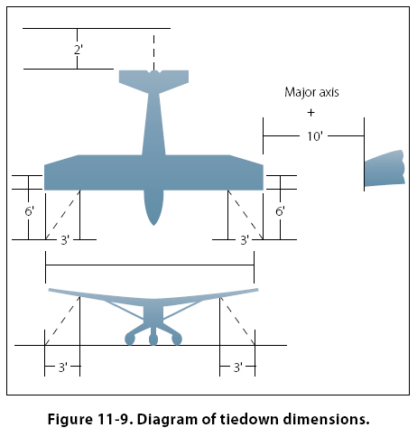 Chapter 11. Safety, Ground Operations, & Servicing Using Fire Extinguishers When using a fire extinguisher, make sure you have the correct type for the fire. Most extinguishers have a pin to pull that will allow the handle to activate the agent. Stand back 8 feet and aim at the base of the fire or flames. Squeeze the lever and sweep side to side until the fire is extinguished. Tiedown Procedures Preparation of Aircraft Aircraft should be tied down after each flight to prevent damage from sudden storms. The direction in which aircraft are to be parked and tied down is determined by prevailing or forecast wind direction. Aircraft should be headed as nearly as possible into the wind, depending on the locations of the parking area’s fixed tiedown points. Spacing of tiedowns should allow for ample wingtip clearance. [Figure 11-9] After the aircraft is properly located, lock the nosewheel or the tailwheel in the fore-and-aft position.