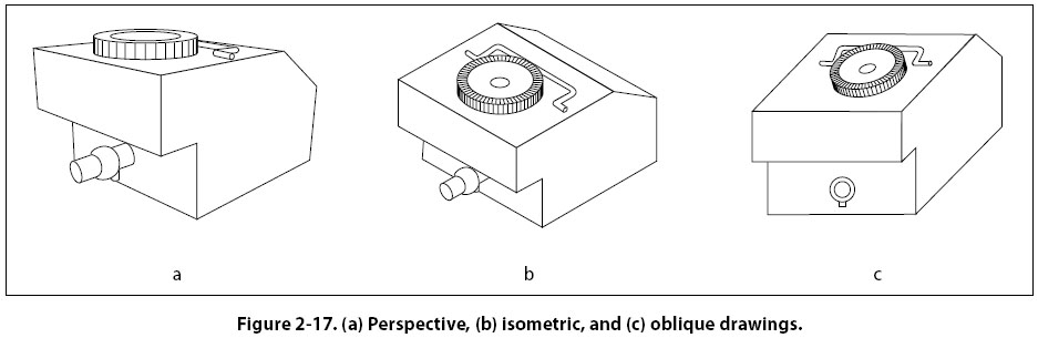 Perspective Drawings A perspective view [Figure 2-17(a)] shows an object as it appears to an observer. It most closely resembles the way an object would look in a photograph. Because of perspective, some of the lines of an object are not parallel and therefore the actual angles and dimensions are not accurate. Isometric Drawings An isometric view [Figure 2-17(b)] uses a combination of the views of an orthographic projection and tilts the object forward so that portions of all three views can be seen in one view. This provides the observer with a three-dimensional view of the object. Unlike a perspective drawing where lines converge and dimensions are not true, lines in an isometric drawing are parallel and dimensioned as they are in an orthographic projection.