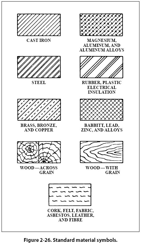 Material Symbols Section line symbols show the kind of material from which the part is to be constructed. The material may not be indicated symbolically if its exact specification is shown elsewhere on the drawing. In this case, the more easily drawn symbol for cast iron is used for the sectioning, and the material specification is listed in the bill of materials or indicated in a note. Figure 2-26 illustrates a few standard material symbols.