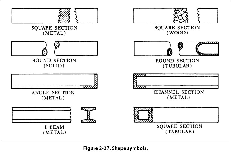 Shape Symbols Symbols can be used to excellent advantage when needed to show the shape of an object. Typical shape symbols used on aircraft drawings are shown in Figure 2-27. Shape symbols are usually shown on a drawing as a revolved or removed section.