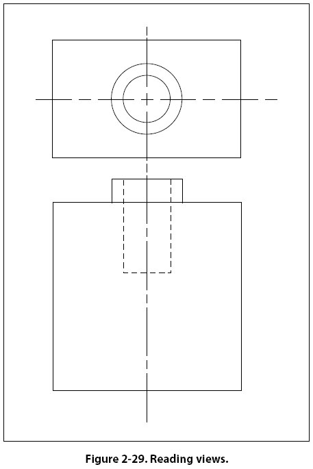 Reading and Interpreting Drawings Aircraft technicians do not necessarily need to be accomplished in making drawings. However, they must have a working knowledge of the information that is to be conveyed to them. They most frequently encounter drawings for construction and assembly of new aircraft and components, during modifications, and for making repairs. A drawing cannot be read all at once any more than a whole page of print can be read at a glance. Both must be read a line at a time. To read a drawing effectively, follow a systematic procedure. Upon opening a drawing, read the drawing number and the description of the article. Next, check the model affected, the latest change letter, and the next assembly listed. Having determined that the drawing is the correct one, proceed to read the illustration(s). In reading a multiview drawing, first get a general idea of the shape of the object by scanning all the views; then select one view for a more careful study. By referring back and forth to the adjacent view, it will be possible to determine what each line represents Each line on a view represents a change in the direction of a surface but another view must be consulted to determine what the change is. For example, a circle on one view may mean either a hole or a protruding boss, as in the top view of the object in Figure 2-29. Looking at the top view, we see two circles; however, the other view must be consulted to determine what each circle represents.