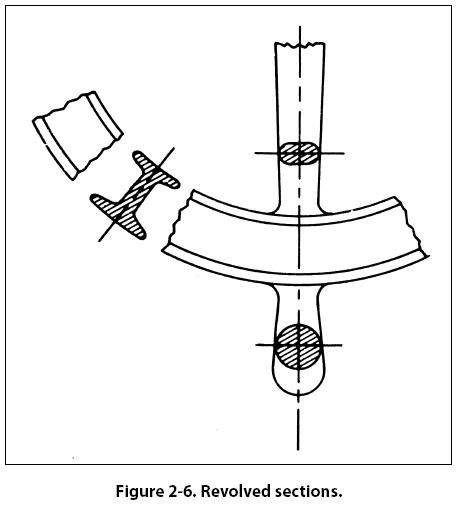 A revolved section drawn directly on the exterior view shows the shape of the cross section of a part, such as the spoke of a wheel. An example of a revolved section is shown in Figure 2-6.