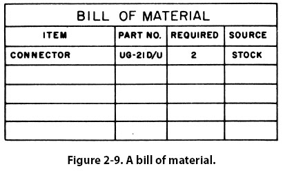 A list of the materials and parts necessary for the fabrication or assembly of a component or system is often included on the drawing. The list is usually in ruled columns in which are listed the part number, name of the part, material from which the part is to be constructed, the quantity required, and the source of the part or material. A typical bill of material is shown in Figure 2-9. On drawings that do not have a bill of material, the data may be indicated directly on the drawing.