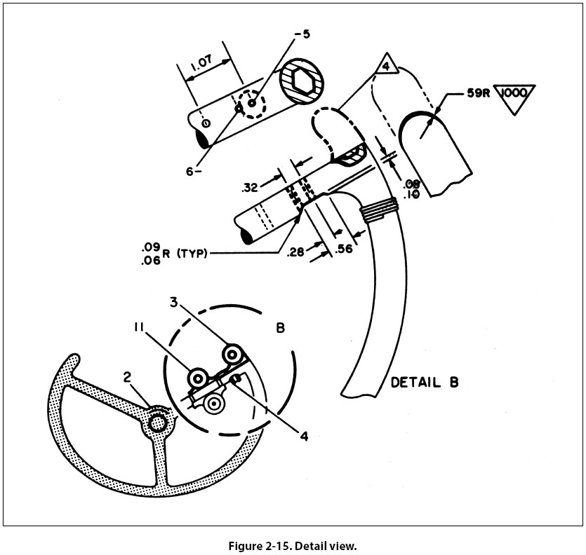 Detail View A detail view shows only a part of the object but in greater detail and to a larger scale than the principal view. The part that is shown in detail elsewhere on the drawing is usually encircled by a heavy line on the principal view. Figure 2-15 is an example of the use of detail views.