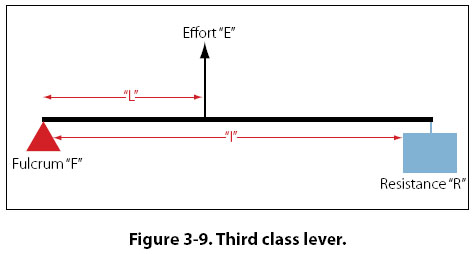 Third Class Lever There are occasions when it is desirable to speed up the movement of the resistance even though a large amount of effort must be used. Levers that help accomplish this are third class levers. As shown in Figure 3-9, the fulcrum is at one end of the lever and the weight or resistance to be overcome is at the other end, with the effort applied at some point between. Third class levers are easily recognized because the effort is applied between the fulcrum and the resistance. The retractable main landing gear on an airplane is a good example of a third class lever. The top of the landing gear, where it attaches to the airplane, is the pivot point. The wheel