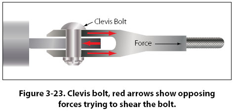 Shear When a shear stress is applied to an object, the force tries to cut or slice through, like a knife cutting through butter. A clevis bolt, which is often used to secure a cable to a part of the airframe, has a shear stress acting on it. As shown in Figure 3-23, a fork fitting is secured to the end of the cable, and the fork attaches to an eye on the airframe with the clevis bolt.