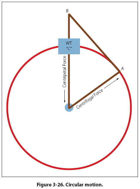 force that is equal to centripetal force, but acting in an opposite direction, is called centrifugal force. Centripetal force is always directly proportional to the mass of the object in circular motion. Thus, if the mass of the object in Figure 3-26 is doubled, the pull on the string must be doubled to keep the object in its circular path, provided the speed of the object remains constant. Centripetal force is inversely proportional to the radius of the circle in which an object travels. If the string in Figure 3-26 is shortened and the speed remains constant, the pull on the string must be increased since the radius is decreased, and the string must pull the object from its linear path more rapidly. Using the same reasoning, the pull on the string must be increased if the object is swung more rapidly in its orbit. Centripetal force is thus directly proportional to the square of the velocity of the object. The formula for centripetal force is: Centripetal Force = Mass (Velocity2) ÷ Radius For the formula above, mass would typically be converted to weight divided by gravity, velocity would be in feet per second, and the radius would be in feet. Example: What would the centripetal force be if a 10 pound weight was moving in a 3-ft radius circular path at a velocity of 500 fps? Centripetal Force = Mass (Velocity2) ÷ Radius> In the condition identified in the example, the object acts like it weighs 2,588 times more than it actually does. It can also be said that the object is experiencing 2,588 Gs (force of gravity). The fan blades in a large turbofan engine, when the engine is operating at maximum rpm, are experiencing many thousands of Gs for the same reason. |