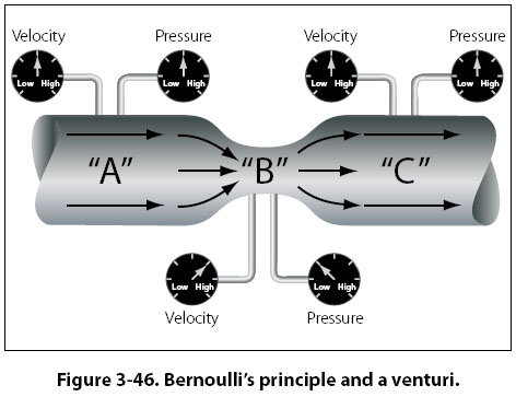 As a liquid (fluid) flows through the venturi tube, the gauges at points “A," “B," and “C" are positioned to register the velocity and the static pressure of the liquid. The venturi in Figure 3-46 can be used to illustrate Bernoulli’s principle, which states that: The static pressure of a fluid (liquid or gas) decreases at points where the velocity of the fluid increases, provided no energy is added to nor taken away from the fluid. The velocity of the air is kinetic energy and the static pressure of the air is potential energy.