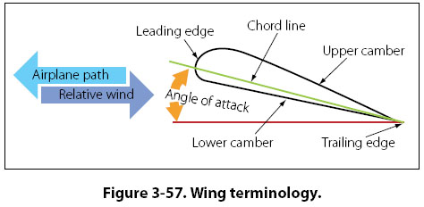 Airfoils An airfoil is any device that creates a force, based on Bernoulli’s principles or Newton’s laws, when air is caused to flow over the surface of the device. An airfoil can be the wing of an airplane, the blade of a propeller, the rotor blade of a helicopter, or the fan blade of a turbofan engine. The wing of an airplane moves through the air because the airplane is in motion, and generates lift by the process previously described. By comparison, a propeller blade, helicopter rotor blade, or turbofan engine fan blade rotates through the air. These rotating blades could be referred to as rotating wings, as is common with helicopters when they are called rotary wing aircraft. The rotating wing can be viewed as a device that creates lift, or just as correctly, it can be viewed as a device that creates thrust. In Figure 3-57 an airfoil (wing) is shown, with some of the terminology that is used to describe a wing. The terms and their meaning are as follows: