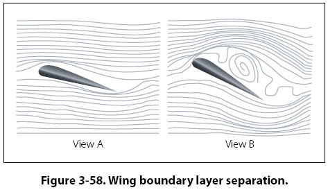 Camber The camber of a wing is the curvature which is present on top and bottom surfaces. The camber on the top is much more pronounced, unless the wing is a symmetrical airfoil, which has the same camber top and bottom. The bottom of the wing, more often than not, is relatively flat. The increased camber on top is what causes the velocity of the air to increase and the static pressure to decrease. The bottom of the wing has less velocity and more static pressure, which is why the wing generates lift. Chord Line The chord line is an imaginary straight line running from the wing’s leading edge to its trailing edge. The angle between the chord line and the longitudinal axis of the airplane is known as the angle of incidence. Relative Wind Whatever direction the airplane is flying, the relative wind is in the opposite direction. If the airplane is flying due north, and someone in the airplane is not shielded from the elements, that person will feel like the wind is coming directly from the south. Angle of Attack The angle between the chord line and the relative wind is the angle of attack. As the angle of attack increases, the lift on the wing increases. If the angle of attack becomes too great, the airflow can separate from the wing and the lift will be destroyed. When this occurs, a condition known as a stall takes place. There are a number of different shapes, known as planforms, that a wing can have. A wing in the shape of a rectangle is very common on small general aviation airplanes. An elliptical shape or tapered wing can also be used, but these do not have as desirable a stall characteristic. For airplanes that operate at high subsonic speeds, sweptback wings are common, and for supersonic flight, a delta shape might be used. The aspect ratio of a wing is the relationship between its span (wingtip to wingtip measurement) and the chord of the wing. If a wing has a long span and a very narrow chord, it is said to have a high aspect ratio. A higher aspect ratio produces less drag for a given flight speed, and is typically found on glider type aircraft. The angle of incidence of a wing is the angle formed by the intersection of the wing chord line and the horizontal plane passing through the longitudinal axis of the aircraft. Many airplanes are designed with a greater angle of incidence at the root of the wing than at the tip, and this is referred to as washout. This feature causes the inboard part of the wing to stall before the outboard part, which helps maintain aileron control during the initial stages of a wing stall. Boundary Layer Airflow The boundary layer is a very thin layer of air lying over the surface of the wing and, for that matter, all other surfaces of the airplane. Because air has viscosity, this layer of air tends to adhere to the wing. As the wing moves forward through the air, the boundary layer at first flows smoothly over the streamlined shape of the airfoil. Here the flow is called the laminar layer. As the boundary layer approaches the center of the wing, it begins to lose speed due to skin friction and it becomes thicker and turbulent. Here it is called the turbulent layer. The point at which the boundary layer changes from laminar to turbulent is called the transition point. Where the boundary layer becomes turbulent, drag due to skin friction is relatively high. As speed increases, the transition point tends to move forward. As the angle of attack increases, the transition point also tends to move forward. With higher angles of attack and further thickening of the boundary layer, the turbulence becomes so great the air breaks away from the surface of the wing. At this point, the lift of the wing is destroyed and a condition known as a stall has occurred. In Figure 3-58, view A shows a normal angle of attack and the airflow staying in contact with the wing. View B shows an extreme angle of attack and the airflow separating and becoming turbulent on the top of the wing. In view B, the wing is in a stall.