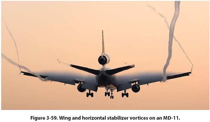 Boundary Layer Control One way of keeping the boundary layer air under control, or lessening its negative effect, is to make the wing’s surface as smooth as possible and to keep it free of dirt and debris. As the friction between the air and the surface of the wing increases, the boundary layer thickens and becomes more turbulent and eventually a wing stall occurs. With a smooth and clean wing surface, the onset of a stall is delayed and the wing can operate at a higher angle of attack. One of the reasons ice forming on a wing can be such a serious problem is because of its effect on boundary layer air. On a high-speed airplane, even a few bugs splattered on the wing’s leading edge can negatively affect boundary layer air. Other methods of controlling boundary layer air include wing leading edge slots, air suction through small holes on the wing’s upper surface, and the use of devices called vortex generators. A wing leading edge slot is a duct that allows air to flow from the bottom of the wing, through the duct, to the top of the wing. As the air flows to the top of the wing, it is directed along the wing’s surface at a high velocity and helps keep the boundary layer from becoming turbulent and separating from the wing’s surface. Another way of controlling boundary layer air is to create a suction on the top of the wing through a large number of small holes. The suction on the top of the wing draws away the slow-moving turbulent air, and helps keep the remainder of the airflow in contact with the wing. Vortex generators are used on airplanes that fly at high subsonic speed, where the velocity of the air on the top of the wing can reach Mach 1. As the air reaches Mach 1 velocity, a shock wave forms on the top of the wing, and the subsequent shock wave causes the air to separate from the wing’s upper surface. Vortex generators are short airfoils, arranged in pairs, located on the wing’s upper surface. They are positioned such that they pull high-energy air down into the boundary layer region and prevent airflow separation. Wingtip Vortices Wingtip vortices are caused by the air beneath the wing, which is at the higher pressure, flowing over the wingtip and up toward the top of the wing. The end result is a spiral or vortex that trails behind the wingtip anytime lift is being produced. This vortex is also referred to as wake turbulence, and is a significant factor in determining how closely one airplane can follow behind another on approach to land. The wake turbulence of a large airplane can cause a smaller airplane, if it is following too closely, to be thrown out of control. Vortices from the wing and from the horizontal stabilizer are quite visible on the MD-11 shown in Figure 3-59.