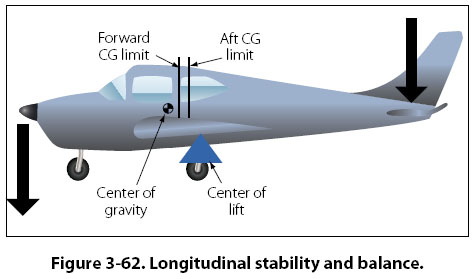 airplane is concentrated. For an airplane to have good longitudinal stability, the center of gravity is typically located forward of the center of lift. This gives the airplane a nose-down pitching tendency, which is balanced out by the force generated at the horizontal stabilizer and elevator. The center of gravity has limits within which it must fall. If it is too far forward, the forces at the tail might not be able to compensate and it may not be possible to keep the nose of the airplane from pitching down.