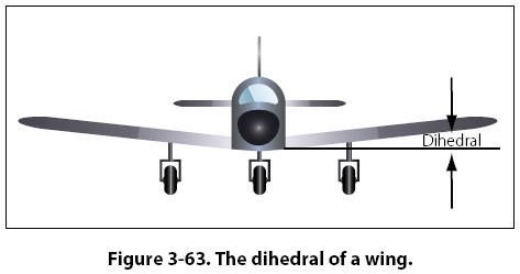Imagine a low wing airplane with a few degrees of dihedral experiencing a disruption of its flightpath such that the left wing drops. When the left wing drops, this will cause the airplane to experience a sideslip toward the low wing. The sideslip causes the low wing to experience a higher angle of attack, which increases its lift and raises it back to a level flight attitude. The dihedral on a wing is shown in Figure 3-63.