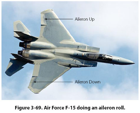 Flight Controls and the Longitudinal Axis The longitudinal axis of the airplane runs through the middle of the airplane, from nose to tail, passing through the center of gravity. Movement around this axis is known as roll, and control around this axis is called lateral control. Movement around this axis is controlled by the ailerons, and on jet transport airplanes, it is aided by surfaces on the wing known as spoilers. The ailerons move as a result of the pilot rotating the control wheel to the left or to the right, much the same as turning the steering wheel on an automobile. [Figure 3-68] When a pilot turns the control wheel to the left, the airplane is being asked to turn or bank to the left. Turning the control wheel to the left causes the trailing edge of the aileron on the left wing to rise up into the airstream, and the aileron on the right wing lowers down into the airstream. This increases the lift on the right wing and decreases the lift on the left wing, causing the right wing to move up and the airplane to bank to the left. In Figure 3-69, an Air Force F-15 can be seen doing an aileron roll. Notice that the left aileron is up and the right aileron is down, which would cause the airplane to roll around the longitudinal axis in a counterclockwise direction.